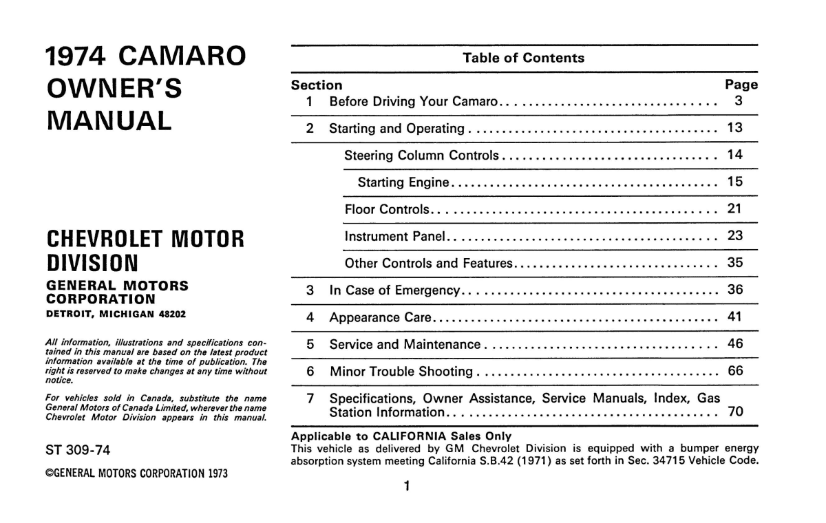 1974 Chevrolet Camaro Owner's Manual