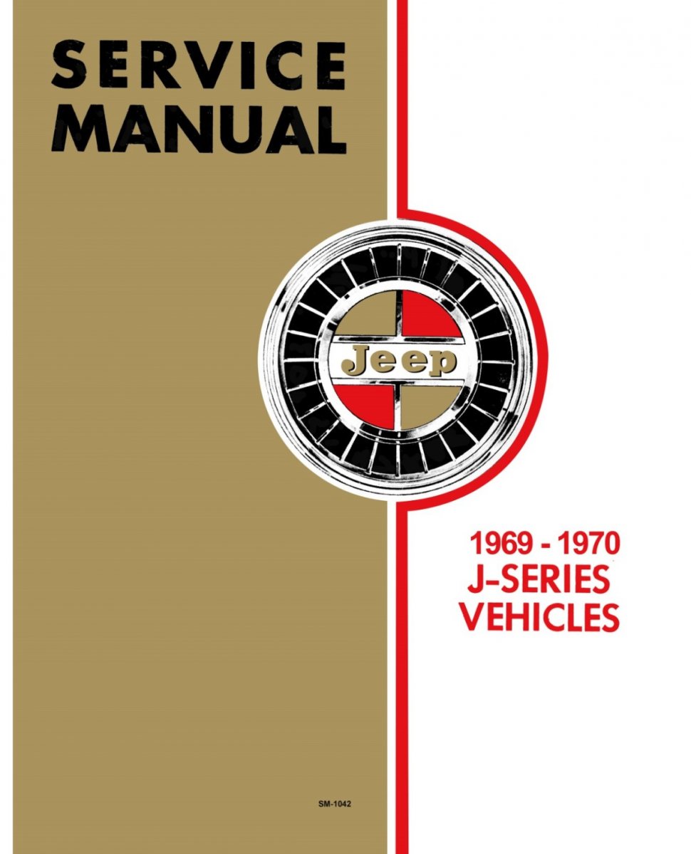 1969-1970 Jeep Gladiator & Wagoneer (J-Series) Service Manual beskriver chassi, fram/bakaxel, transmission, bränsle, kylsystem, elektriskt, bromsar, tändning, styrning och olika funktioner.