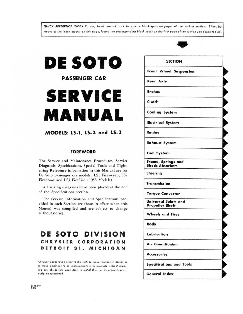 1958-59 Desoto Service Manual innehåller beskrivningar hur man servar och reparerar framvagn, bromsar, transmission,styrning, kylsystem, kraftöverföring, motor, AC, avgas elsystem med mera.