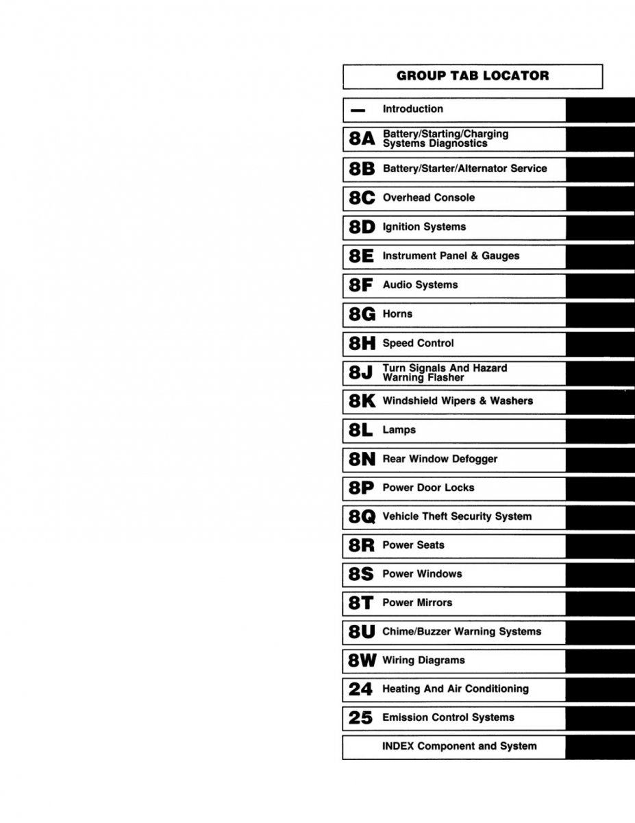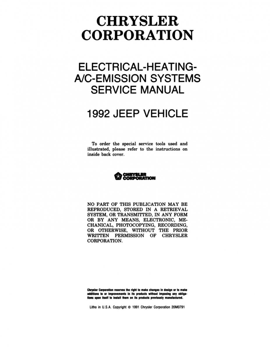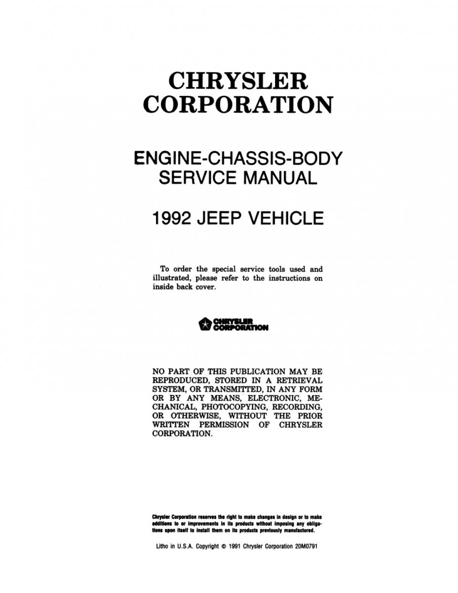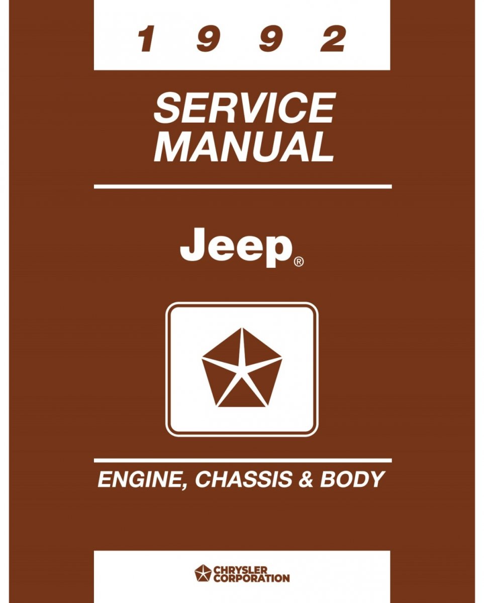 1992 Jeep Service Manual, Innehåll beskrivning chassi, fram/bakaxel, transmission, bränsle, kylsystem, elektriskt, bromsar, tändning, styrning, AC , värme, kylsystem, kaross, avgas, inredning mm flera funktioner.
