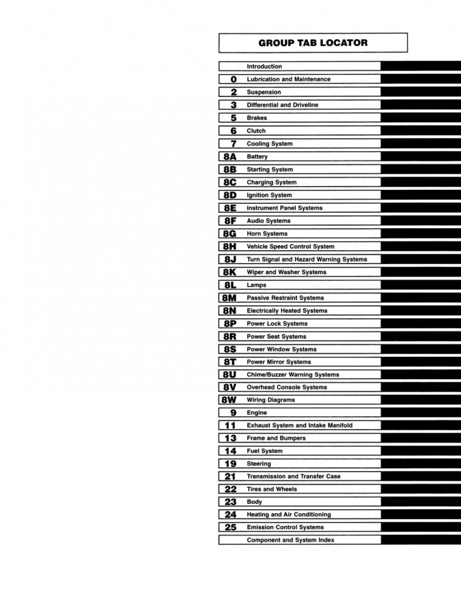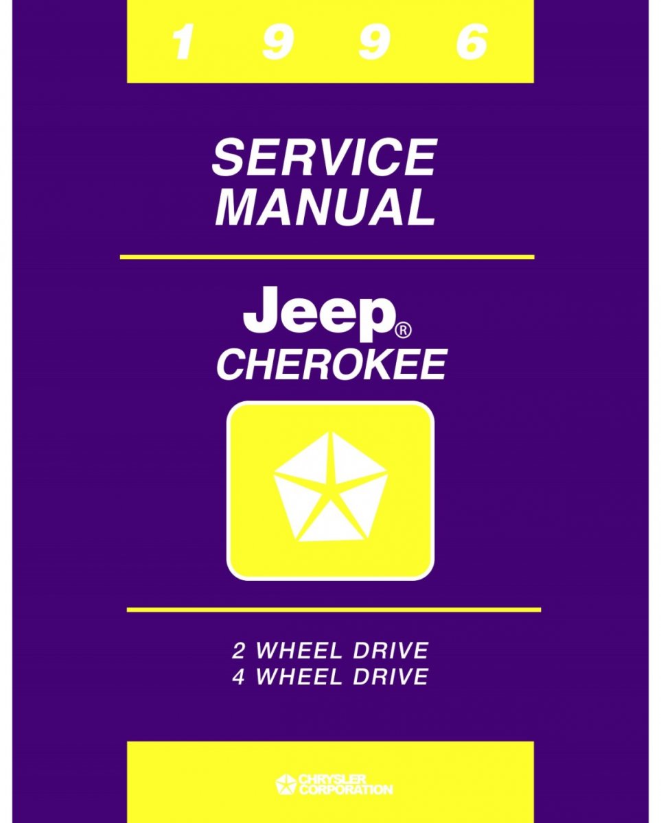 1996 Jeep Cherokee Service Manual, Innehåll beskrivning chassi, fram/bakaxel, transmission, bränsle, kylsystem, elektriskt, bromsar, tändning, styrning, AC , värme, kylsystem, kaross, avgas, inredning mm flera funktioner.