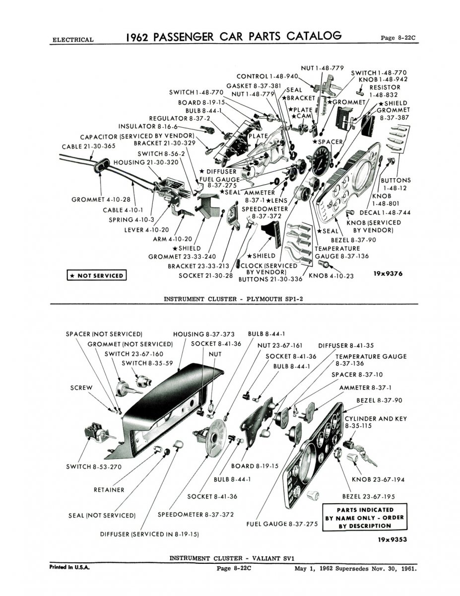 1962 Mopar Passenger Car Parts Catalog beskriver och visar ingående delar med artikelnummer och ritningar.