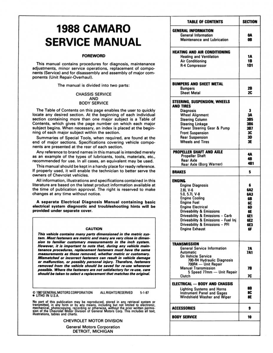 1988 Chevrolet Camaro Service Manual (Chassis & Body)