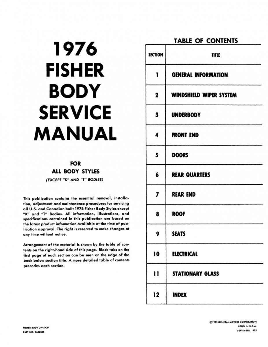 1976 Fisher Body Service Manual beskriver service och reparation av karosserna såsom fönstermekanismer, justering av rutor, innertak, lister, inredning, el med flera kupe och kaross relaterade komponenter.