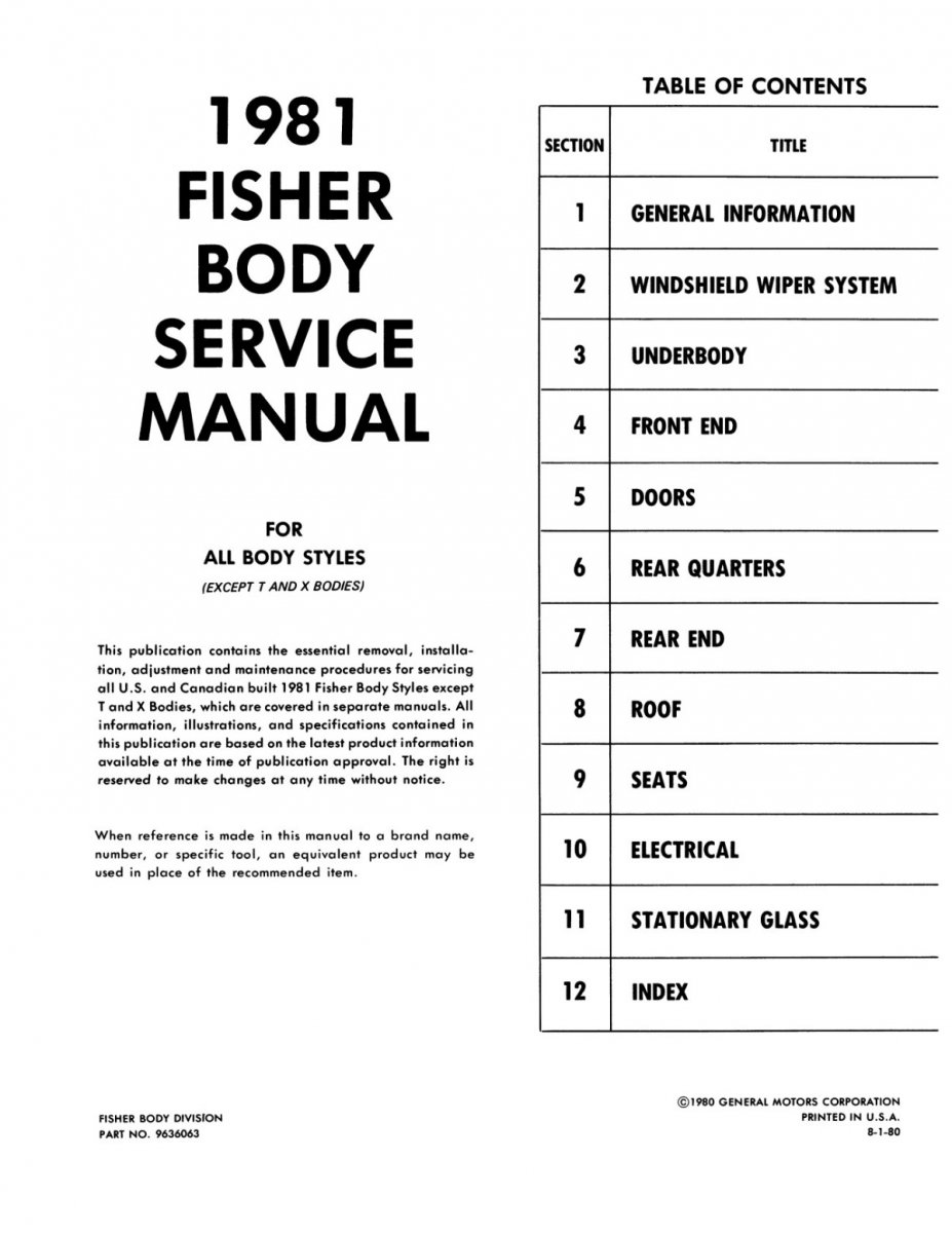1981 Fisher Body Service Manual beskriver service och reparation av karosserna såsom fönstermekanismer, justering av rutor, innertak, lister, inredning, el med flera kupe och kaross relaterade komponenter.