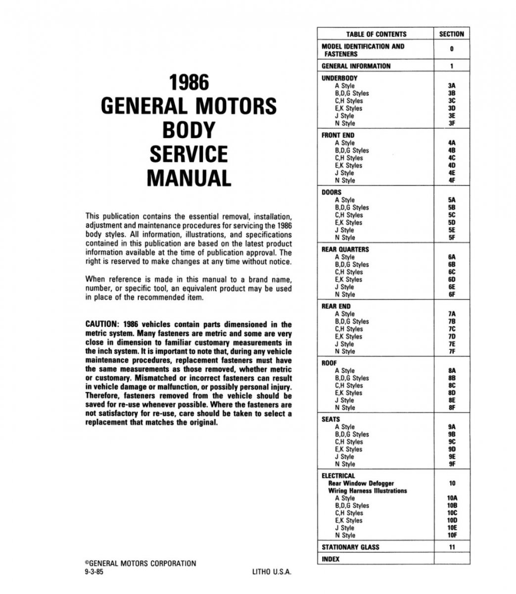 1986 General Motors Body Service Manual, behandlar service och reparation av karosserna såsom fönstermekanismer, justering av rutor, innertak, lister, inredning, el med flera kupe och kaross relaterade komponenter.
