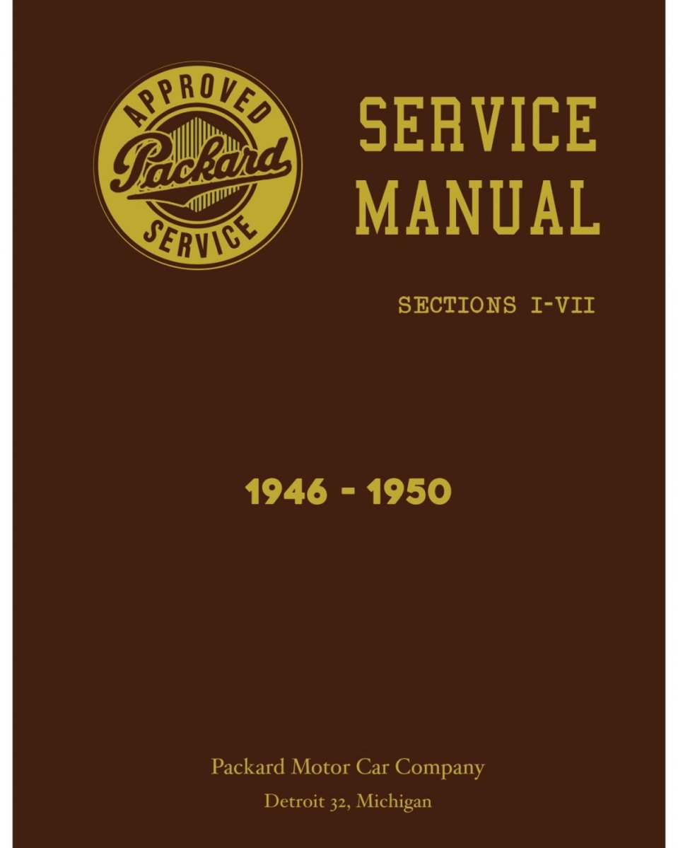 1946-1950 Packard Service Manual beskriver smörjning, motor. koppling, transmission, chassi, styrning, bromsar, el, bränsle, bakaxel, kylsystem, rutor, cab mm.